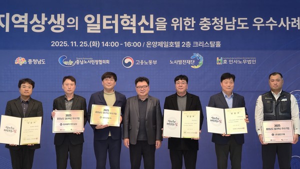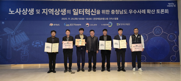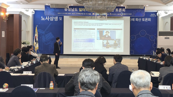 충남도와 충남노사민정협의회는 25일 오후 2시 아산시 온양제일호텔에서 '2025 충청남도 일터혁신 우수사업장 선정과 사례 확산 방안 모색 토론회'를 열고 도내 기업의 에너지진단 등 조직혁신 확산 방안을 논의했다.