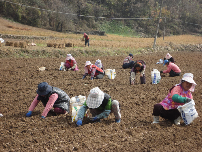 ▲ 지난달 31일 단양군 적성면 상원곡리 표성연씨 밭에서 마늘을 파종하는 아낙들의 손길이 분주하다. 단양 육쪽마늘은 석회암 지대의 황토밭에서 재배돼 맛과 향이 강하고 조직이 단단해 저장성이 우수하다. 해마다 이맘 때가 파종 적기로 늦어도 이달 초까지는 마무리 해야 이듬 해 6월 하지를 전·후해 수확할 수 있다. © 편집부