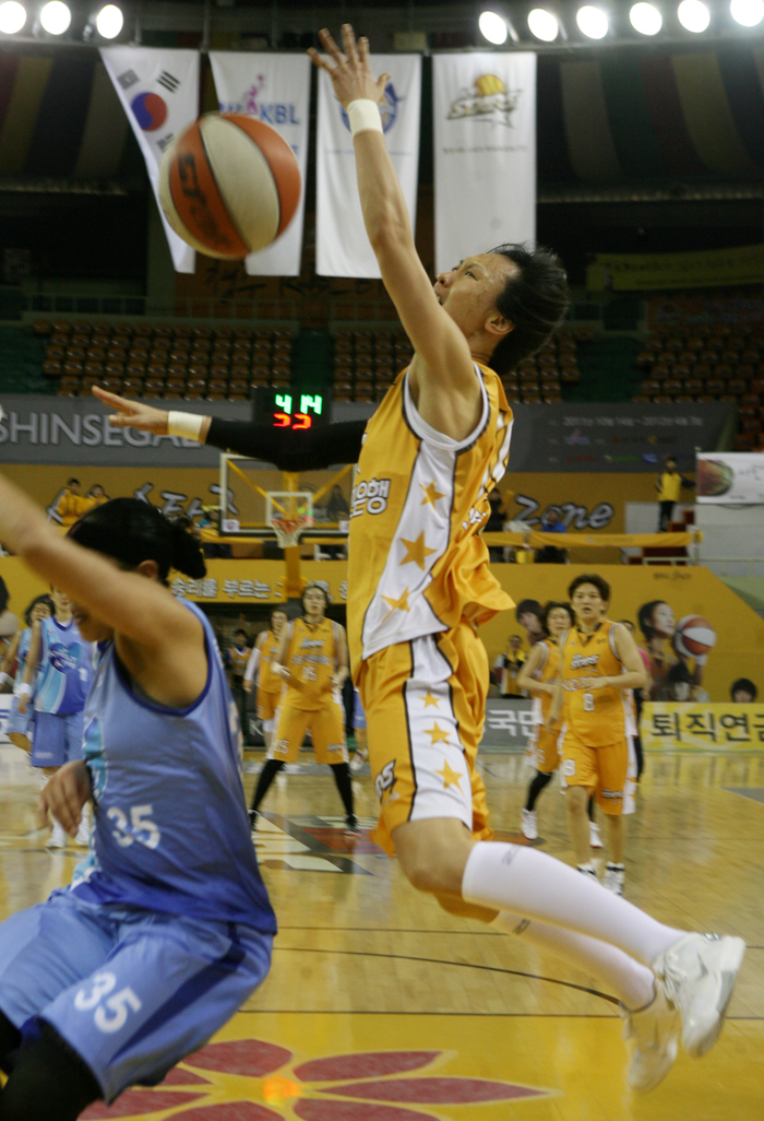 ▲ 11일 청주 실내체육관에서 열린 '2011~2012 신세계 이마트 여자프로농구' 청주 KB스타즈와 용인 삼성생명의 경기에서 KB스타즈 변연하 선수가 슛을 하고 있다. /권보람기자 © 편집부{루미광고}