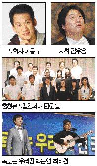 28일 오후 3시 청주 중앙동 청소년광장 특설무대에서 열리는 창단 연주회에는 최근 국제적 이슈가 되고 있는 독도와 관련 .우리땅 지키기에 대한 범국민적 열망을 안고 우리 귀에 익숙한 독도는 우리땅 원 작사·작곡자인 박문영씨와 테너 최태경씨가 30년만에 새로 편곡한 '독도는 우리땅'을 선보이고 충청뮤지컬 컴퍼니 단원들이 잘 알려진 팝송 등을 들려 드립니다.
