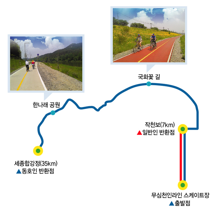 △동호인(09:10 출발):무심천 인라인스케이트장(출발점)→작천보(7km지점)→세종합강정(35km지점 반환점)→무심천 인라인스케이트장(도착점)