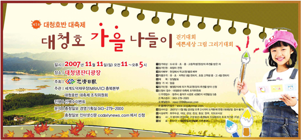 주5일제의 시작으로 주말, 휴일이 되면 가족들과 어디를 갈까 고민하는 가족들이 늘어만 가고 있다. 청주만 하더라도 상당산성, 동물원, 오창 호수공원, 대청댐...'역사의 증인' 충청일보사는 2007년 11월 11일 아름다운 경관을 자랑하는 대청호 일원에서 누구나 참여하고 같이할 수 있는 제1회 대청호반 대축제를 개최합니다. 청주•청원민들의 레져․문화공간으로 자리 잡고 있는 수려한 대청호반 일원에서 일반인들을 위한 걷기대회, 예쁜 세상 그림 그리기 대회등 대청호반 대축제가 열립니다. 그림, 걷기를 통해 풍부한 상상력과 가족간의 화합을 이루며, 또 온가족이 함께 걸으면서 건강증진에 기어코자하오니 많은 관심과 참여 바랍니다.