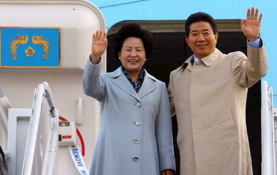 노무현 대통령이 싱가포르에서 열리는 제11차 아세안(동남아국가연합)+3(한.중.일) 정상회의 등에 참석하기 위해 19일 오전 특별기편으로 부인 권양숙 여사와 함께 출국하기에 앞서 인사를 하고 있다.