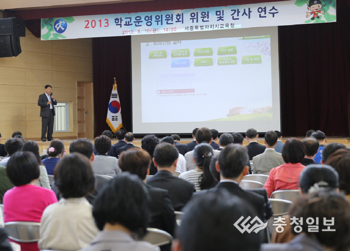 [세종=충청일보 전병찬기자]세종시교육청이 지난 10일 도담중학교에서 공·사립 유·초·중·고등학교 학교운영위원과 간사 487명을 대상으로 단위학교 자치역량 강화를 위한 '2013년 학교운영위원회 전문성 강화 연수'를 개최했다.이번 연수는 학교운영위원회 회의절차와 심의사항 등에 대해 몇 년동안 학교운영위원으로 활동하고 있는 현직 운영위원장의 강의를 통해 학교운영위원으로서 숙지해야 할 제반 사항들에 대해 보다 쉽게 이해할 수 있도록 진행됐다. 차명호 평택대학교 교수를 초빙, '행복한 부모와 자녀의 레시피' 강연을 통해 자녀들의 행복한 학교생활을 위해 학교운영위원으로서 수행해야 할 역할 등에 대한 특강은 참가자들로부터 호응을 얻었다. ▲ 세종시교육청이 지난 10일 도담중학교에서 단위학교 자치역량 강화를 위한 '2013년 학교운영위원회 전문성 강화 연수'를 열었다. © 편집부