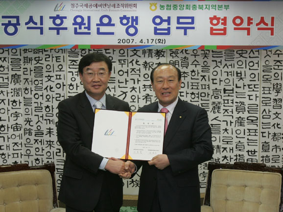 청주국제공예비엔날레조직위원장인 남상우 청주시장과 농협중앙회 충북지역 이종환 본부장은 " 2007 청주국제공에비엔날레의 성공적 개최를 위해 상호 노력한다"는 내용의 협약서에 서명한 뒤 향후 행사와 관련한 업무 협조 방안도 논의했다.