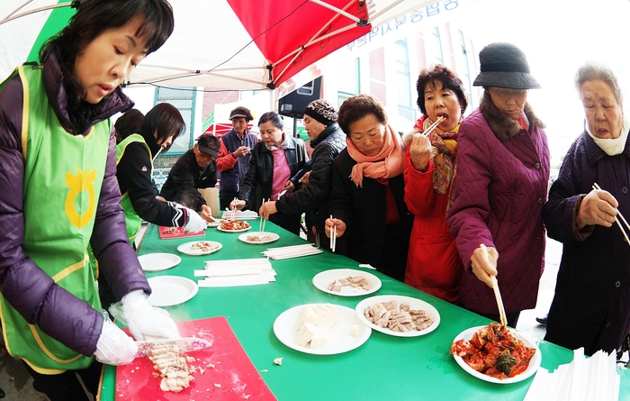 [충청일보 이정규기자] 충북농협은 22일 돼지고기 하락으로 어려움을 겪고 있는 양돈 농가를 돕기 위해 본부 후정에서 열린 김장시장에서 김장김치와 국산 돼지고기 수육 시식행사를 펼쳤다.이날 행사는 양돈농가를 위로하고 소비를 확대하기 위해 양돈자조금 주최로 행사를 열었으며 더불어 국산 돼지고기를 20% 이상 할인 판매했다.충북농협 관계자는"김치와 돼지고기가 궁합이 잘 맞아 김장하는 날에는 수육이 빠지질 않았다"며 "고객들이 돼지고기를 많이 소비해 양돈농가도 돕고 김장철 가족 건강도 챙기길 바란다"고 말했다.한편 충북농협은 이날 김장시장을 끝으로 올해 금요시장을 폐장하고 내년 4월에 재개장한다.▲ 충북농협은 돼지고기 소비촉진을 위해 지난 22일 열린 김장시장에서 시식과 판매 행사를 펼쳤다. © 편집부