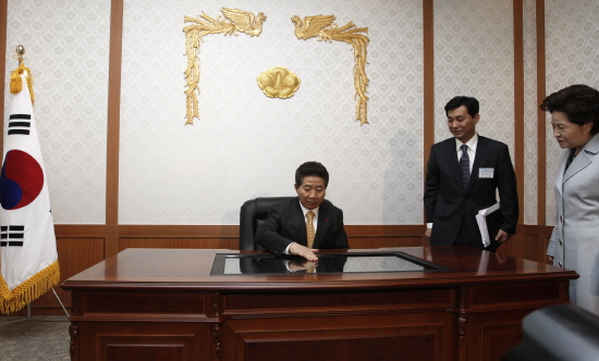 노무현 대통령이 22일 오후 성남 나라기록관내 대통령 기록관을 방문, '대통령이 되어보다'코너에 마련된 모형 대통령 집무실에서 터치 스크린을 통해 사진을 찍어보고 있다. 이 코너에서 일반 관람객들은 대통령 자리에 앉아 사진을 찍은뒤 자신의 이메일로 기념사진을 보내 받아볼 수가 있다.