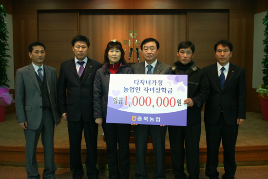 농협충북지역본부는 4일 충북 청원군 문의면 구룡리에 거주하고 있는 다자녀 가정 농업인 오영만(53세)씨를 지역본부로 초청해 장학금 100만원을 전달하고 격려했다. /강명수 기자 shotoverman@