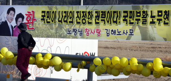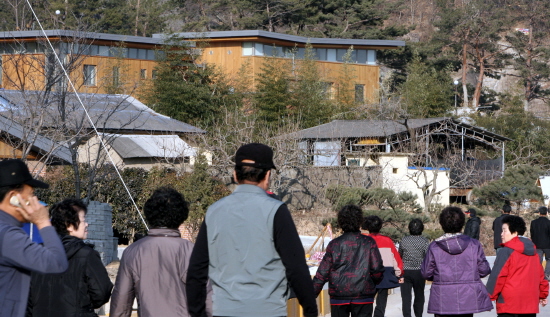 노무현 대통령의 귀향을 4일 앞둔 21일 고향인 경남 김해시 진영읍 본산리 봉하마을에는 귀향한 대통령이 머물 사저를 구경하기 위한 관광객들이 눈에 띠게 늘었다.사진 위쪽 황토빛 건물이 대통령 사저다.