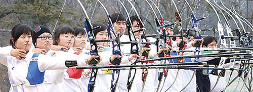 <사진설명=양궁 선수들이 과녁을 향해 시위를 당기고 있다 >