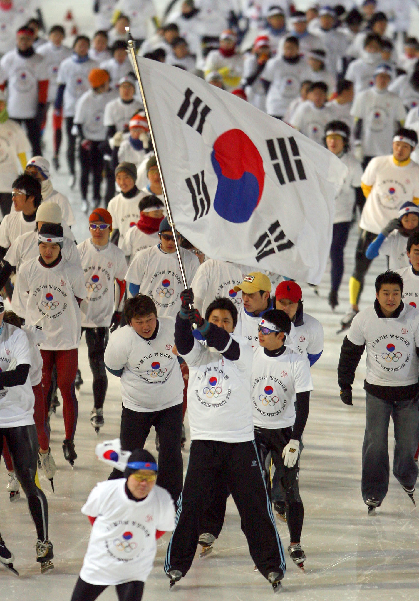 | ▲ (서울=연합뉴스) 3.1절 88주년을 맞이해 순국선열에 대한 애도와 애국애족의 정신을 기리기 위해 서울 태릉국제스케이장에서 열린 3.1절 기념 빙상마라톤 대회에서 빙상인들이 태극기를 두르고 빙판을 질주하고 있다.ⓒ연합뉴스 |