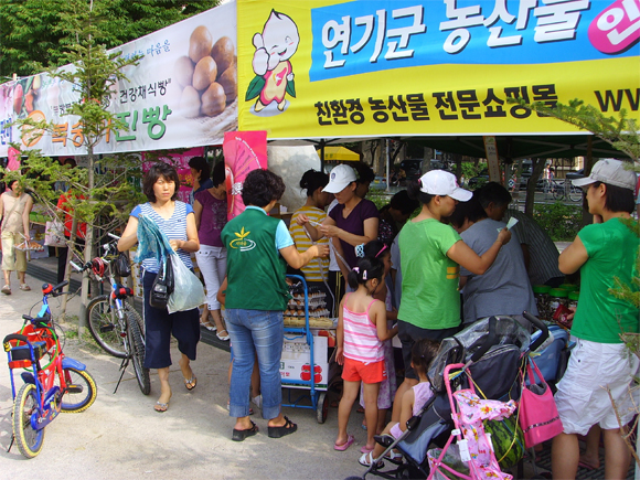 <사진설명= 연기군 농산물 출하협의회가 서울 상계동에서 도시민을 대상으로 도·농 농산물 직거래장터를 개설 높은 성과를 거두었다.>