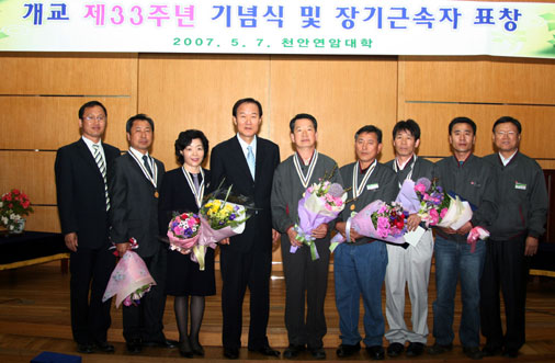 천안연암대(학장 정광수)는 7일 대학 본부동 시청각실에서 개교 33주년 기념행사 및 장기 근속자 표창을 가졌다.