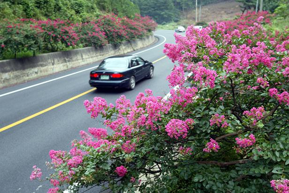태안군내 국도변을 따라 백일홍이 활짝 펴 그 자태를 뽐내고 있다. 꽃이 백일 정도 펴서 백일홍이라는 이름을 가진 배롱나무가 태안군 국도변을 빨갛게 수놓고 있어 지나는 관광객들의 눈을 즐겁게 하고 있다. /태안=김수경기자 yes4000@