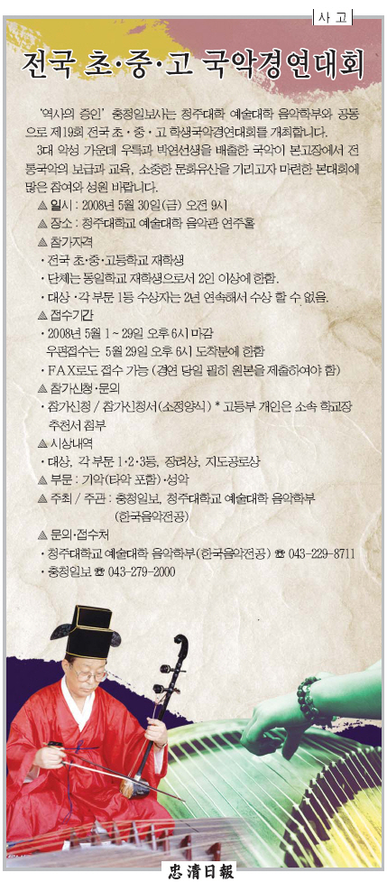 '역사의 증인' 충청일보사는 청주대학 예술대학 음악학부와 공동 으로 제19회 전국 초·중·고 학생국악경연대회를 개최합니다.