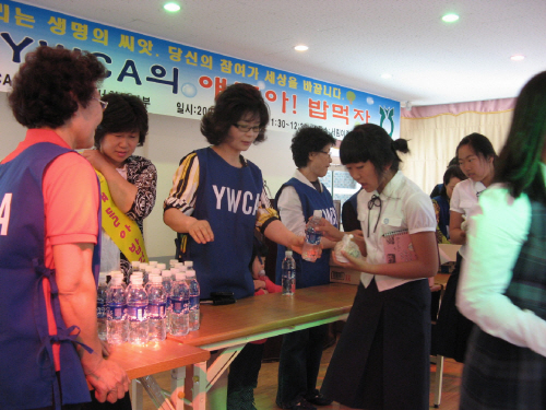 '얘들아! 밥 먹자'라는 슬로건 아래 펼친 이번 행사는 우리 쌀의 우수성 홍보와 자라나는 2세들의 아침밥 결식률을 줄이기 위한 것으로 농협에서 제공한 쌀로 ywca회원들이 손수 만든 주먹밥과 음료수가 학생들에게 제공됐다.