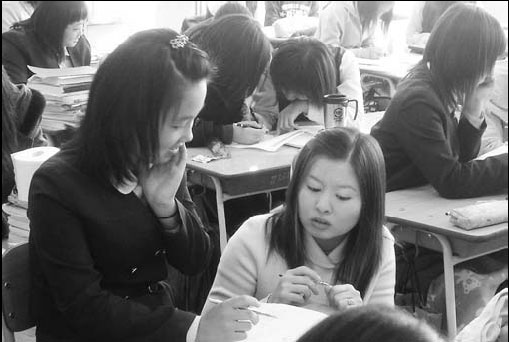 | ▲태안여자중학교 수학 교사가 수준별 이동수업에서 개별지도를 하고 있다. |