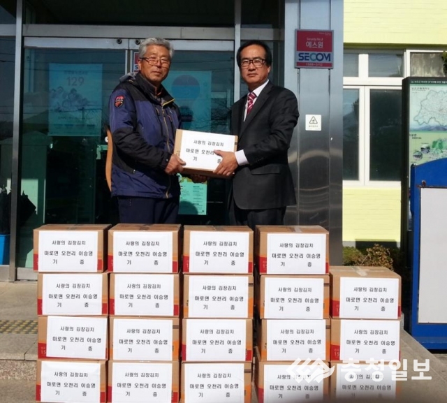 [보은=충청일보 주현주기자] 보은군 마로면 오천리 이승영(70)·어복식씨(63)부부가 지난 19일 올해도 어김없이 마로면사무소를 방문, 이웃사랑으로 버무린 김장김치 22상자(10㎏)를 기탁했다.