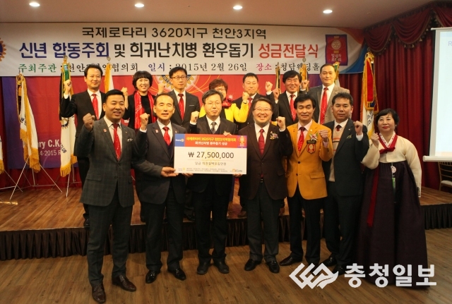 [천안=충청일보 김병한기자] 국제로타리3620지구 천안3지역 협의회(회장 서영석)가 희귀난치병 환우돕기 성금 2750만원을 단국대병원에 기탁했다.