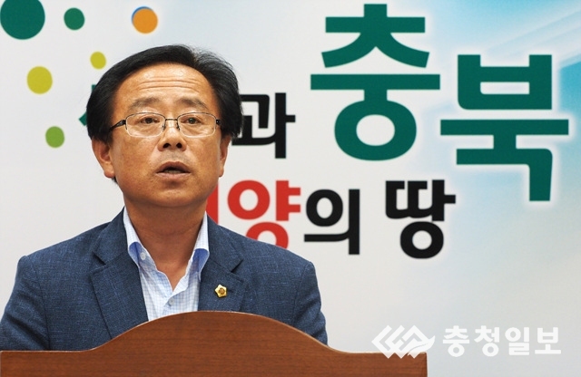 [충청일보 배훈식 기자] 임회무 충북도의회 의원이 25일 충북도청 브리핑실에서 기자회견을 열고 2015 괴산 세계유기농산업엑스포 성공 개최 호소문을 발표하고 있다.