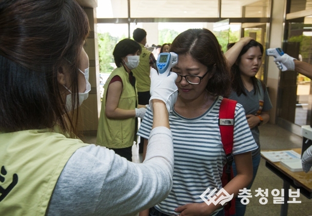 [충청일보 배훈식 기자] 중동호흡기증후군(MERS)의 진정세가 주춤한 가운데 27일 충북공고 시험장에서 충북도교육청 공무원들이 지방교육공무원 임용시험 응시자들의 체온을 측정하고 있다.