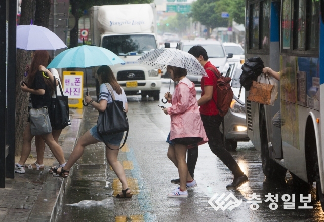 [충청일보 배훈식기자]절기상 소서(小暑)인 7일 9호 태풍 찬홈의 영향으로 장마전선이 북상하며 비가 내리는 가운데 충북 청주 지하상가 정류장에서 우산을 든 시민들이 버스에서 내리고 있다.