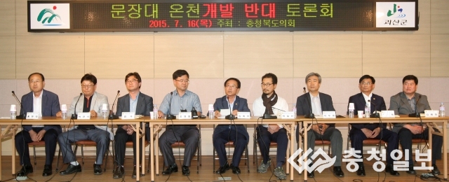 충북도의회 주최로 16일 충북 괴산군 청천면 푸른내 문화센터에서 열린 '문장대 온천개발 반대 토론회'에 나온 토론자들이 열띤 토론을 하고 있다. 왼쪽부터 홍현대 충청북도 환경정책과장·박관서 괴산청천군민대책위원장·염우 풀꿈환경재단 상임이사·조영철 충북대학교 환경공학과 교수·임회무 충북도의회 행정문화위원회 위원장·박일선 문장대온천개발저지 충북범도민 대책위 공동준비위원장·이두영 문장대온천개발저지 충북범도민 대책위 공동준비위원장·임순묵 충북도의회 의원·김해영 괴산군의회 의원. /권보람기자