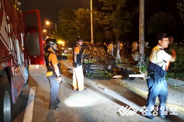 ◇청주서 교통사고로 차량 전복=지난달 31일 밤 11시40분쯤 충북 청주시 상당구 명암타워 인근 도로에서 율량동에서 용암동 방면으로 향하던 K5승용차(운전자 L씨·31)가 가로수 다섯 그루를 잇따라 들이받고 전복(사진)됐다. 이 사고로 L씨가 크게 다쳐 인근병원으로 옮겨져 치료를 받고 있다. 경찰은 "사고 차량이 또 다른 차량과 속도 경쟁을 하다 사고가 난 것 같다"는 목격자들의 진술을 토대로 정확한 사고 경위를 조사 중이다.