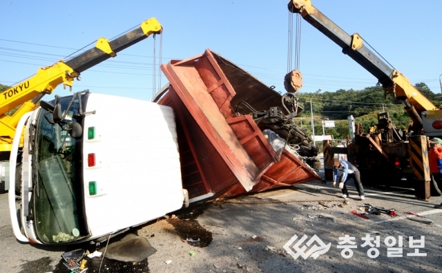 13일 오후 2시59분쯤 상당구 명암동 산성도로와 1순환로 합류부에서 5t 화물트럭(운전자 A씨·52)이 전도되면서 반대편 차선에서 신호대기하던 싼타페 승용차(운전자 N씨·48)와 25t 화물트럭을 들이받았다. 이 사고로 A씨 등 운전자 2명이 다쳐 인근 병원으로 옮겨졌다.
