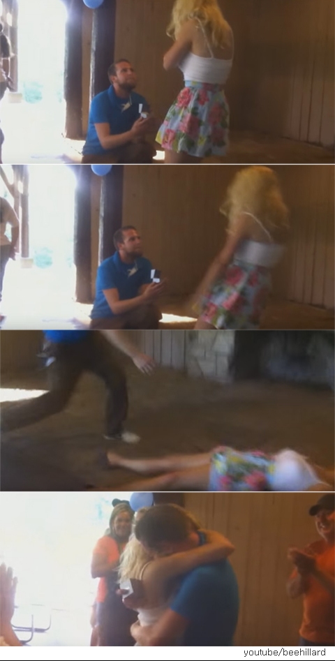 청혼을 받고 기절한 여자의 이름은 브리타니 힐러드. 그녀의 남자친구는 여자에게 눈가리개를 씌운 후 청혼 장소로 데려갔다. 여자는 아무 것도 몰랐던 것으로 보인다. 어리둥절하던 여자는 드디어 상황을 파악했다. 무릎을 꿇은 남자친구가 청혼반지를 건네자 여자는 기절했다. 뒤로 쓰러졌다.