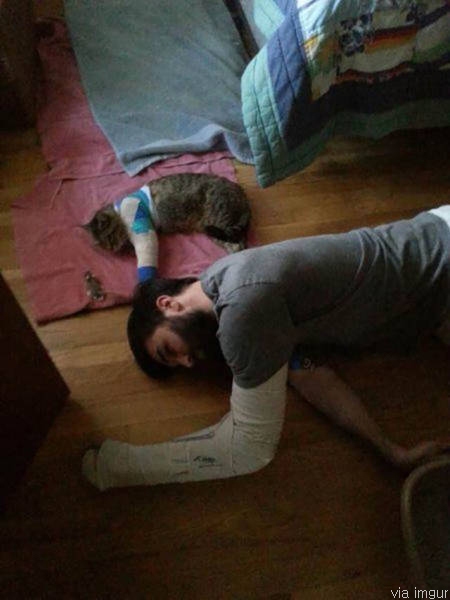 해외 누리꾼들은 웃고 감탄하게 만드는 사진은 한 소셜 미디어에 공개된 것이다. 고양이와 주인이 같은 자세로 잔다. 그리고 같은 곳을 다쳐 같은 치료를 받고 있는 중이다.