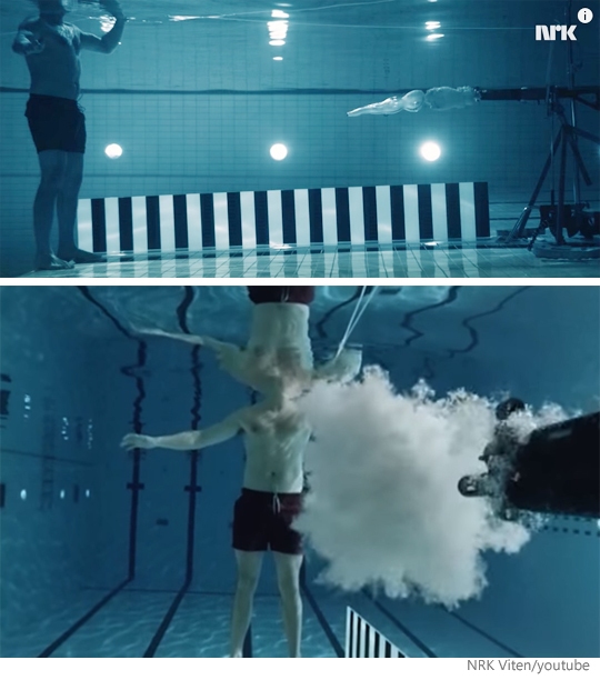 물리학자가 생명을 지킨 것은 물 분자들이 공기 분자보다 훨씬 밀착해 있어 더 큰 저항을 만든 덕분이다. 물속에서는 발사된 총탄은 속도가 급격히 낮아지고 바로 코앞에 툭 떨어지고 마는 것이죠. 이런 사실을 입증하기 위해, 물리학자는 스스로 저격하는 아찔한 실험을 나섰던 것입니다. /오수현 리포터