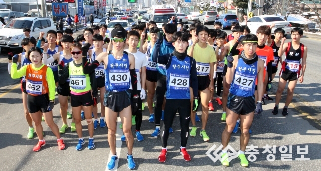 충청일보와 충북육상경기연맹이 공동 주최한 '제50회 3·1절 경축 단축마라톤대회'에 참가한 선수들이 출발 전 파이팅을 외치며 선전을 다짐하고 있다./임동빈기자