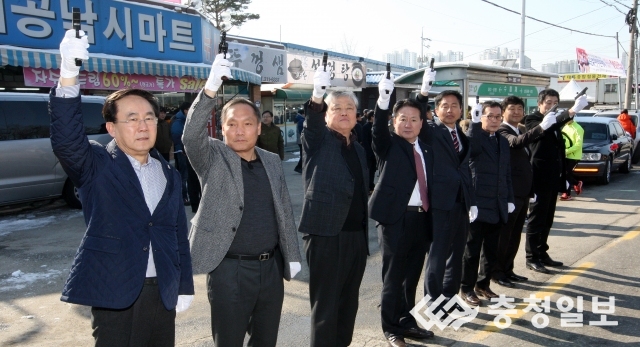 충청일보와 충북육상경기연맹이 공동 주최한 '제50회 3·1절 경축 단축마라톤대회'에서 이규택 충청일보 회장과 신동삼 충북도육상경기연맹회장 등 참석 내빈들이 시총을 하고 있다. /임동빈기자