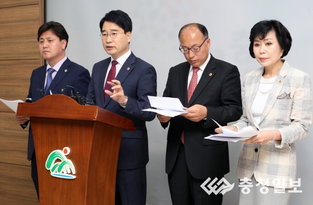 충북도의회 교육위원회 소속 새누리당 이종욱·윤홍창·정영수·김양희(왼쪽부터) 의원이 26일 충북도청에서 기자회견을 열고 "교육현장의 혼란과 도민간 갈등을 조장하는 충북교육공동체권리헌장 제정을 즉각 중단하라"고 촉구했다. /권보람기자
