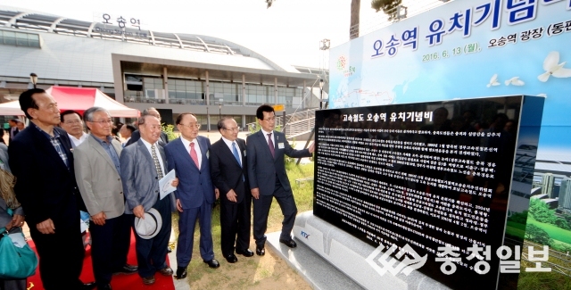 [충청일보 이정규기자] 충북도는 13일 국가X축 철도망 중심으로 자리매김한 KTX오송역에서 오송역 탄생의 역사를 기록한 '고속철도 오송역 유치기념비 건립 제막식'을 거행했다.