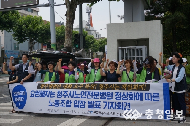 공공운수노조 의료연대본부 충북지역지부는 21일 청주시청 정문 앞에서 기자회견을 열고 "청주병원이 노조의 면담 요구 공문을 무시했고, 면담 일정 자체를 고려하지 않고 있다"고 주장했다.