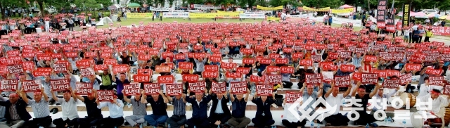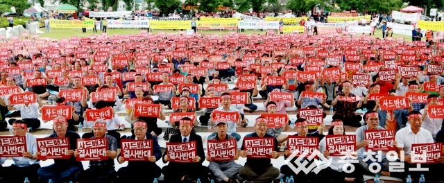 11일 음성군 음성읍 설성공원에서 열린 '사드 배치 반대 범군민 결의대회'에서 3000여명의 참석자들이 사드(THAAD) 배치 계획 철회를 촉구하는 구호를 외치고 있다./임동빈기자