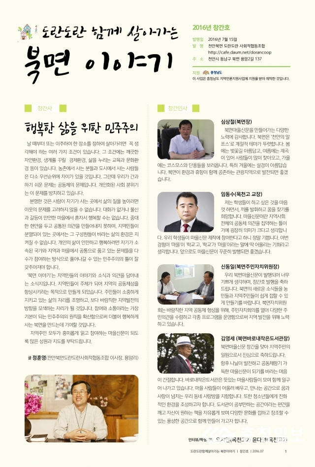 충남 천안시 북면 도란도란 사회적협동조합(이사장 정훈영)은 지난 15일 북면마을신문인 '도란도란 함께 살아가는 북면 이야기(사진)'를 첫 발행했다.