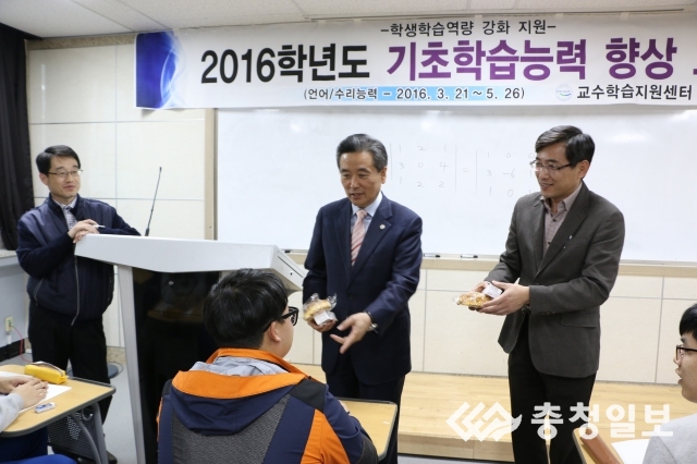 함승덕 총장이 학업의 열기를 북돋우기 위해 야간교육이 진행되고 있는 강의실을 방문해 빵과 음료를 나눠주며 격려할 정도로 각별한 관심을 쏟고 있다.