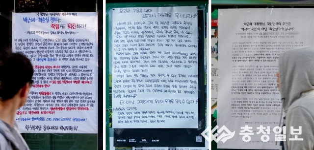 [충청일보 김규철·박성진기자] 충청권에서 최순실게이트와 관련, 박근혜 대통령의 퇴진을 촉구하는 집회와 대자보가 이어지고 있다.