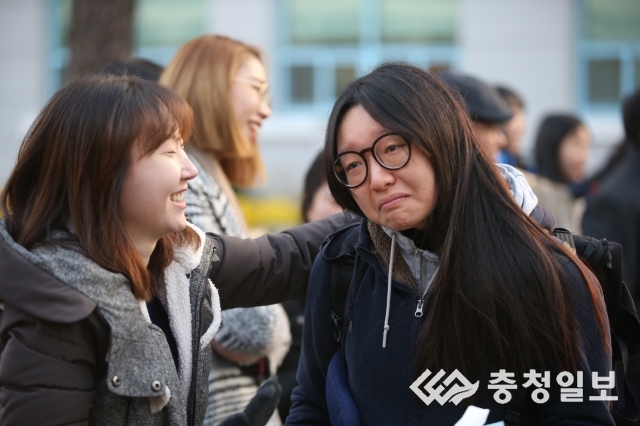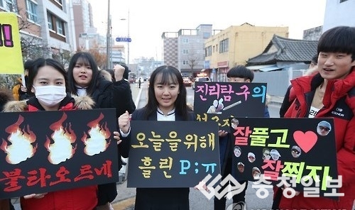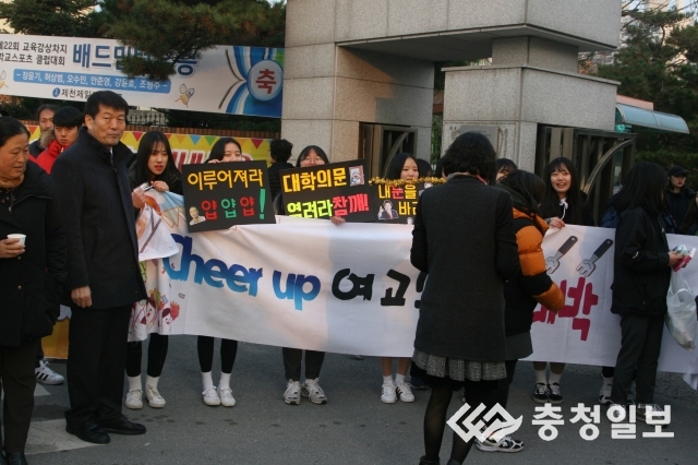 [제천=충청일보 박장규기자] 58지구(제천) 제3시험장인 제천여고 앞에서도 오전 6시 이전부터 50여명의 학생들이 잘 보고 잘 풀고 잘 찍자는 응원 구호부터 이모티콘을 활용한 오늘을 위해 흘린 피·땀·눈물에 이르기까지 다양한 내용의 현수막과 손팻말을 들고 응원전을 펼치고 있다.