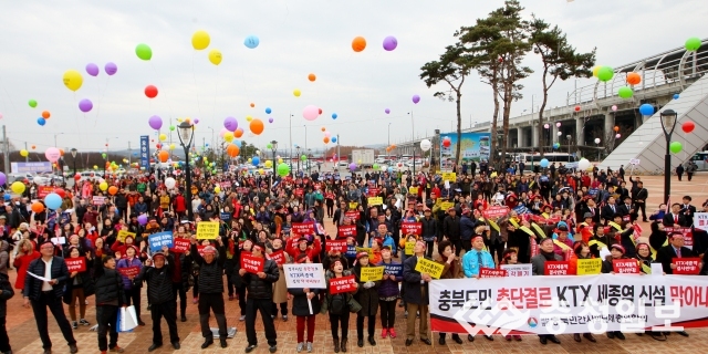 21일 충북 청주시 KTX오송역 광장에서 열린 KTX세종역 신설 백지화촉구 대정부규탄대회에서 참석자들이 오송역 활성화 및 국토균형발전을 기원하는 풍선을 날리고 있다. /권보람기자