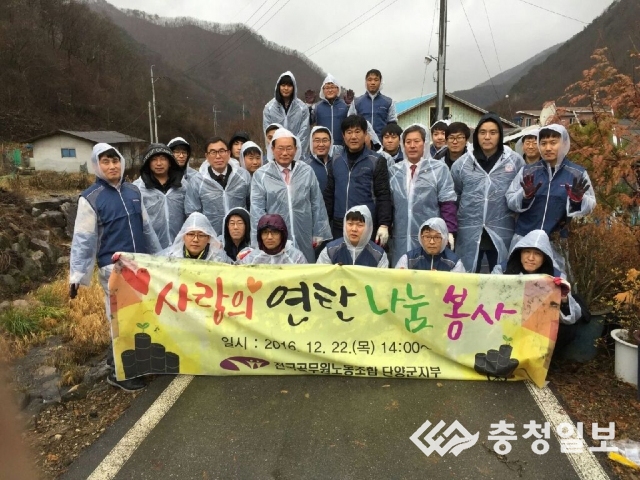 [단양=충청일보 박장규기자] 전국공무원노조 단양군지부가 지난 22일 형편이 어려운 이웃들의 따뜻한 겨울나기를 위한 '사랑의 연탄 나눔'을 펼쳤다.