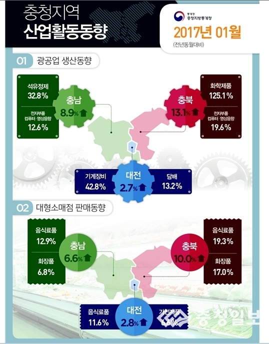 충남은 석유정제(32.8% 증가) 등의 영향으로 생산이 8.9% 늘었고, 대전은 기계장비(42.8% 증가)를 앞세워 2.7% 증가율을 보였다.