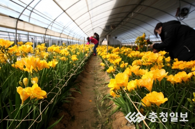 [당진=충청일보 최근석기자] 불경기와 청탁금지법 시행으로 화훼소비가 위축되고 있는 가운데 당진에서 프리지어 수확체험행사를 통해 돌파구 찾기에 나서 주목받고 있다.