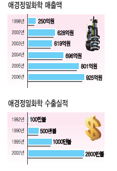 이와 같이 애경정밀화학은 과감한 증설투자로 1998년 250억원에 불과하던 매출액을2002년 628억원으로 확대했으며, 2003년619억원, 2004년 696억원, 2005년 801억원, 2006년 925억원에 이어 올해 목표는1100억원이라는 계획을 목표로 하고 있다.
