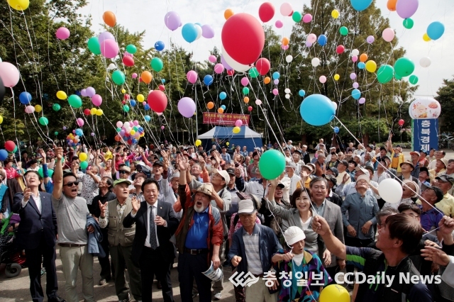 26일 청주 중앙공원에서 열린 '2017 팔월한가위 민속문화축제'에서 김양희 충북도의장, 황영호 청주시의장을 비롯한 참석자들이 풍성한 한가위를 기원하며 풍선을 날리고 있다. /권보람기자