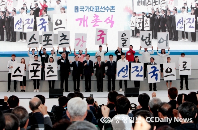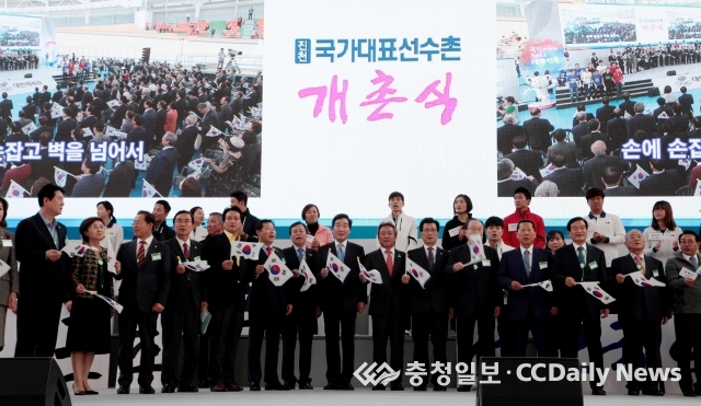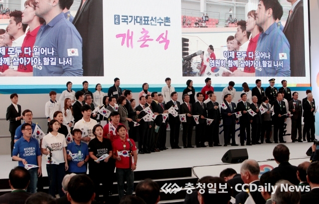 27일 충북 진천군에서 열린 국가대표 선수촌 개촌식에 참석한 이낙연 국무총리, 도종환 문화체육관광부 장관, 이시종 충북지사를 비롯한 참석자들이 태극기를 흔들며 '손에 손잡고'를 부르고 있다. /권보람기자