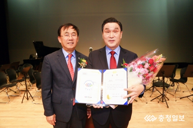 37회 충북 시·군대항 역전마라톤대회 개회식 및 8회 충청대상 시상식이 열린 10일 단양 문화예술회관에서 이규택 충청일보 회장이 지역발전 부문을 수상한 김정구 충북도민회 중앙회 수석부회장과 기념촬영을 하고 있다. /권보람기자